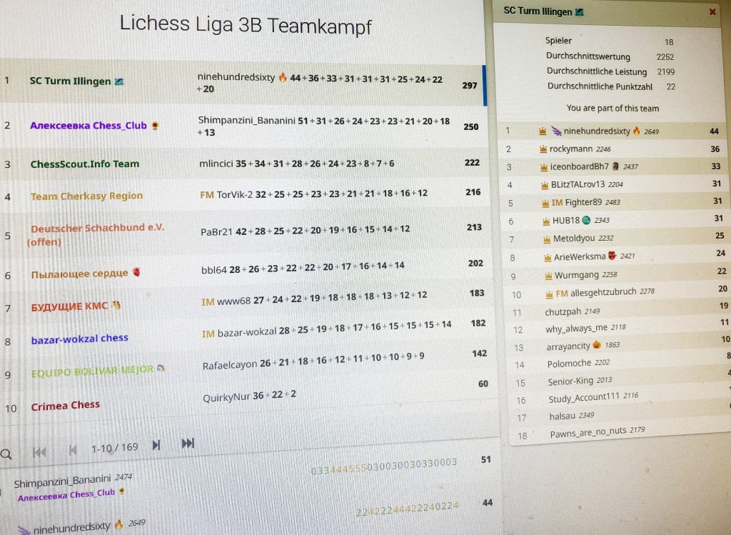 Der Zweite, der Алексеевка Chess_Club, hat sich nach Kräften gewehrt, war eine halbe Stunde vor dem Ende sogar vorne. Aber dann der unwiderstehliche Endspurt der TURM-Blitzer. Die Wende wurde eingeleitet mit einem Sieg des überragenden NINEHUNDREDSIXTY gegen den Tagesbesten SHIMPANZINI_BANANINI.