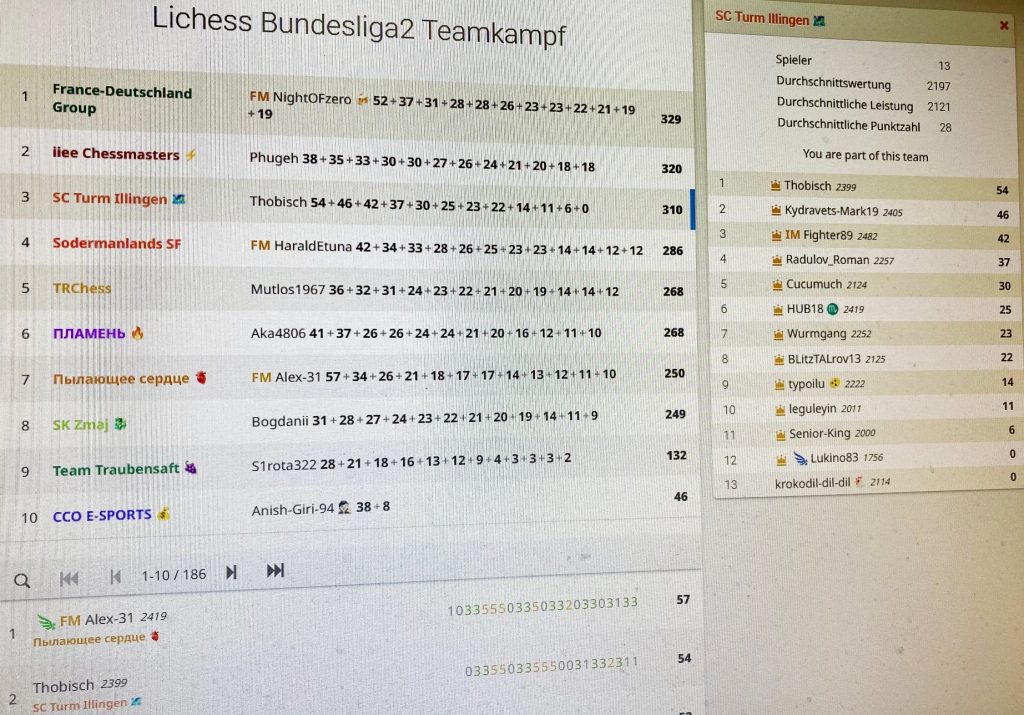 12 kommen in der 2. Bundesliga bei LICHESS in die Wertung. Lediglich 13 waren beim SC TURM gemeldet, aber nur 11 haben gepunktet. Trotzdem der Aufstieg ins LICHESS-Paradies 1. Bundesliga. Der Grund: der schmale Tross bestand aus Hochkarätern! THOBISCH, lange Zeit die Nr. 1 des Feldes, wurde am Ende Zweiter der 186 Akteure, KYDRAVETS-MARK19 alias Alexander Drozd Dritter, IM FIGHTER alias Atila Gajo Figura Vierter. Atila war wie Thomas Deutscher Jungendmeister, sogar in drei Altersklassen! Mit RADULOV_ROMAN schaffte es noch ein weiterer TURM-Blitzer unter die Top10, bemerkenswert!