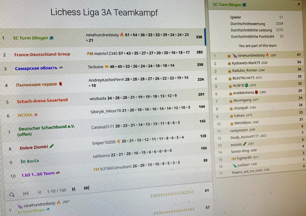 KYDRAVETS-MARK19 alias Alexander Drozd, 12-jähriges Schachjuwel aus Weißrussland. Alexander wurde Dritter der 160 Akteure. Ganz vorne unser Topscorer NINEHUNDREDSIXTY mit Gewinnrate 89% und Turnierleistung 2703 – großartig! Auch RADULOV_ROMAN schaffte es unter die TOP10, BLITZTALROV, HUB18 und ARIEWERKSMA folgen auf den Plätzen 12, 13 und 14.
