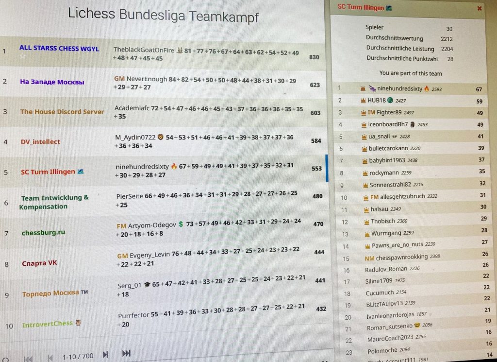 Bei starker Konkurrenz sicher die Bundesliga 1 gehalten, keine Selbstverständlichkeit. Angeführt von NINEHUNDREDSIXTY, der es unter die TOP10 der 700 Akteure schaffte, überzeugte der SC TURM durch seine Ausgeglichenheit. Diese fehlte diesmal TORPEDO MOSKAU und INTROVERT CHESS – die Nr.2 und die Nr.3 des LICHESS Rankings mussten absteigen. Der SC TURM behauptete Rang 8!