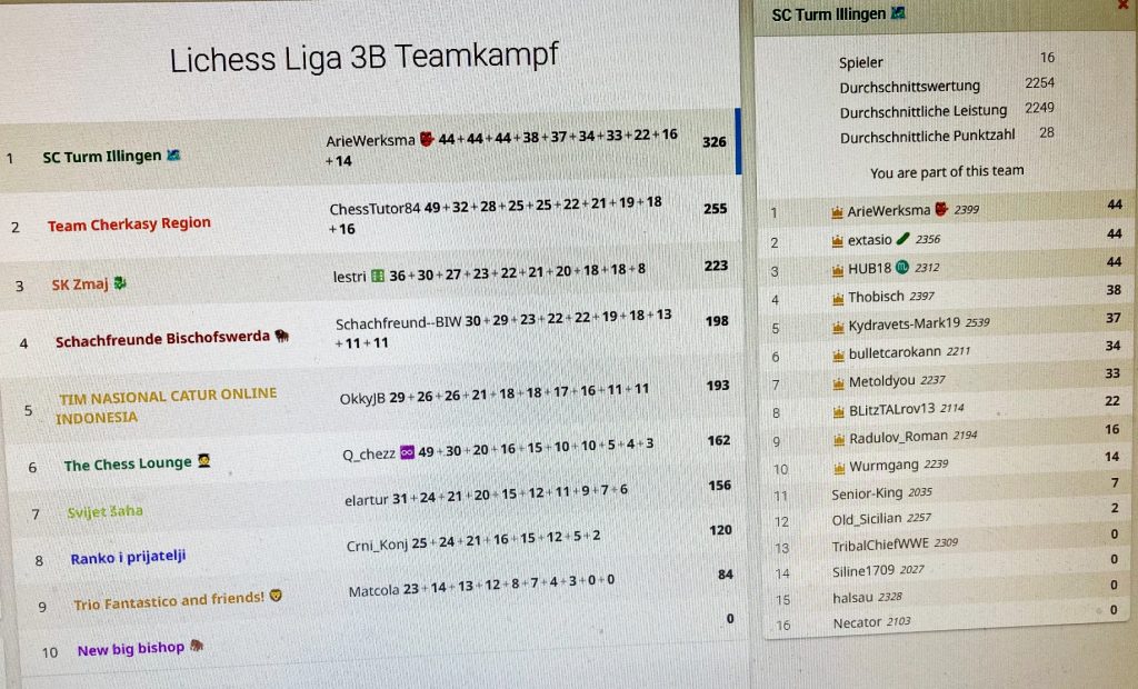 Der Ausrutscher letzten Sonntag wurde postwendend korrigiert. Mit einer Machtdemonstration meldete sich der SC TURM zurück. 71 Punkte Vorsprung auf den Zweiten, 7 Spieler unter den TOP 10: ARIEWERKSMA auf 3, dann EXTASIO, HUB18, THOBISCH, KYDRAVETS-MARK 19, BULLETCAROCANN und METOLDYOU – großartig!